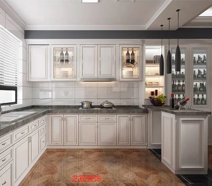 厨房橱柜采用暖被色系,显得格外的清爽,与深灰色台面形成反差更显欧式的奢华