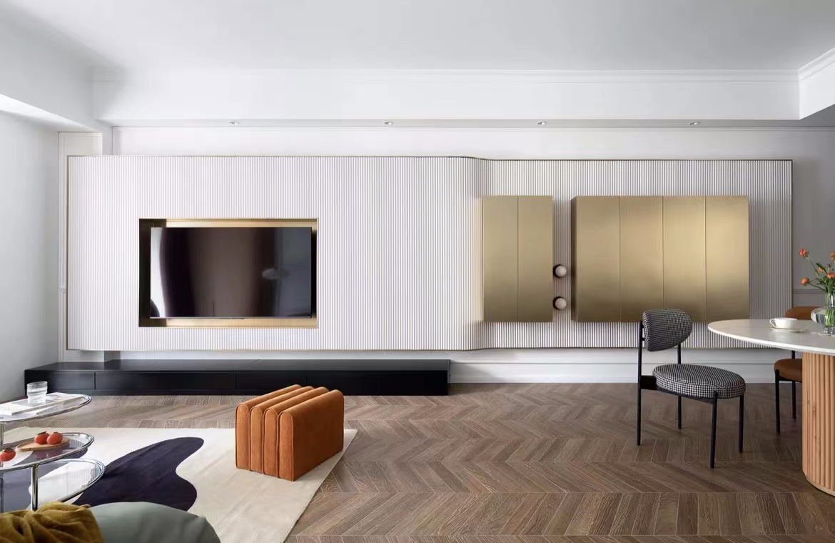 白色波浪板和黄铜质感的柜体形成错落有致的背景墙