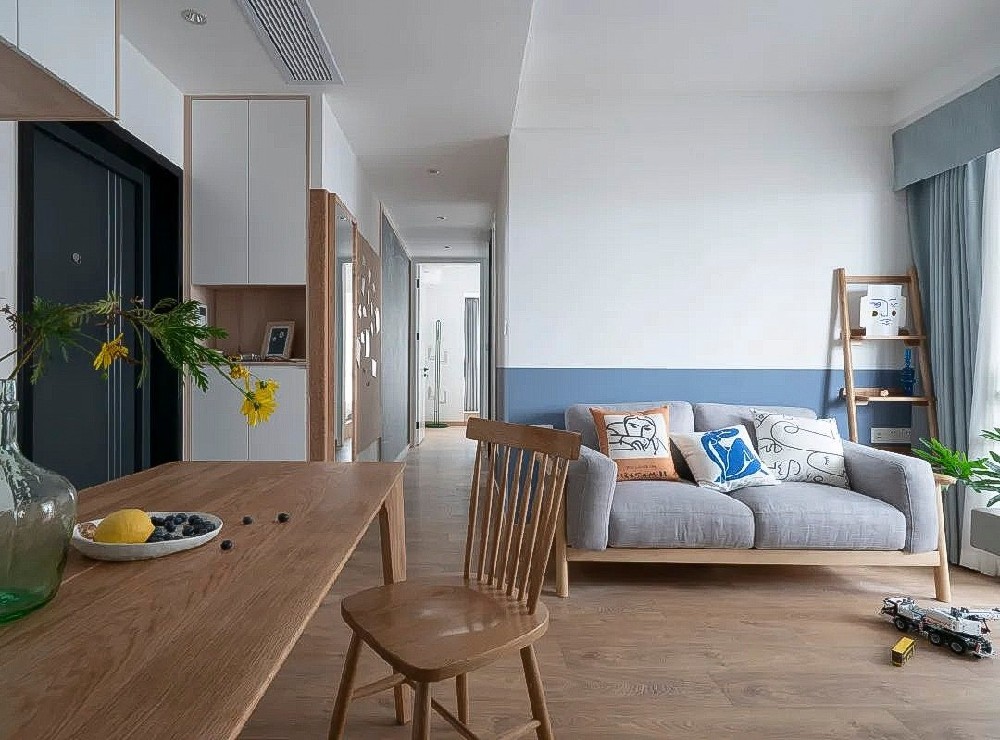 整个客厅的布置简单而温馨, 半墙蓝色漆打破了单一白墙的乏味, 抱枕上的抽象人物画更融入了些许趣味。