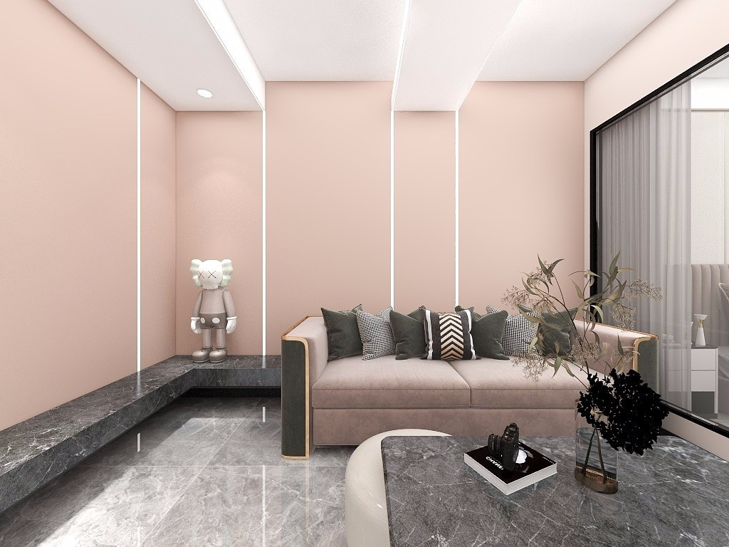 业主为单身女性,粉色与黑灰色的撞色完美契合业主的喜好,客厅与卧室之间采用了挖空采用玻璃设计,完美解决客厅光线问题