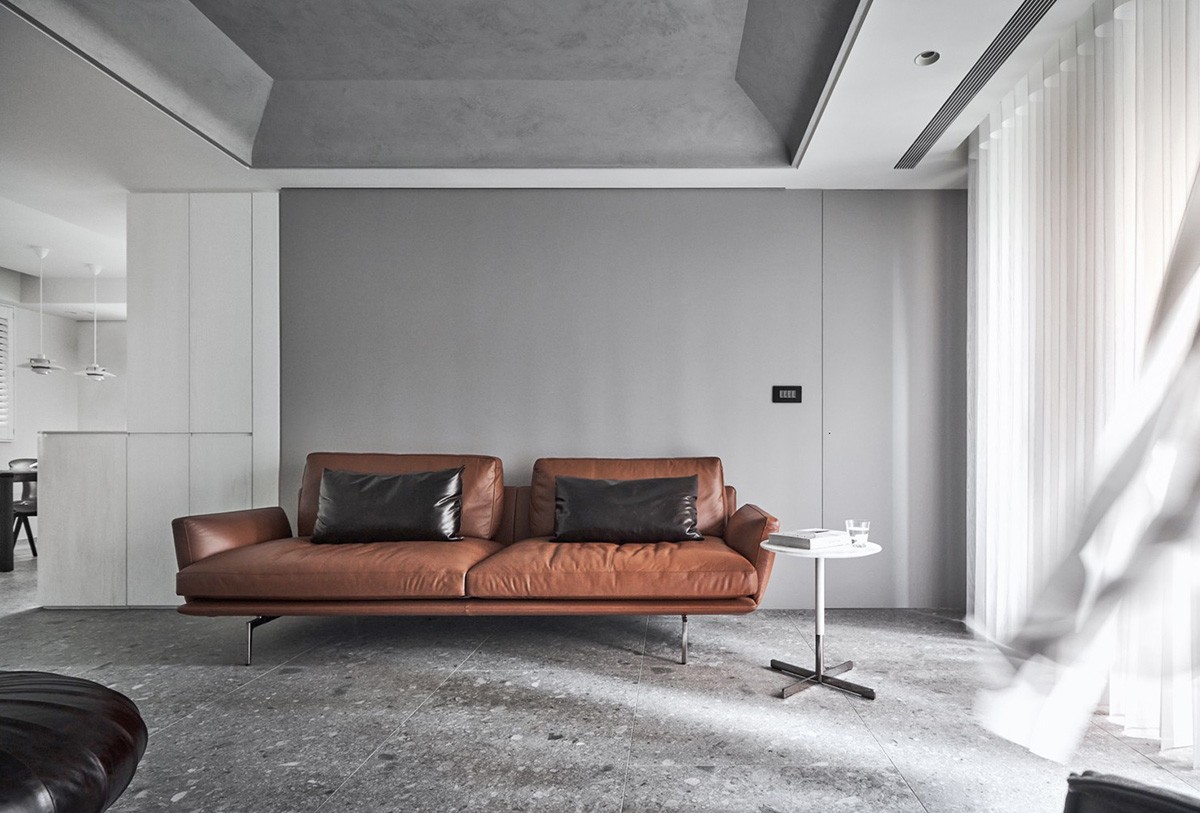 客厅以水磨石瓷砖铺地,采用灰色涂料在天花板延伸到立面,下衔接到电视柜再改以温润木色接续,靠窗处以白色窗帘勾勒洁净感,让采光无阻碍迈入室内,保持室内亮度。