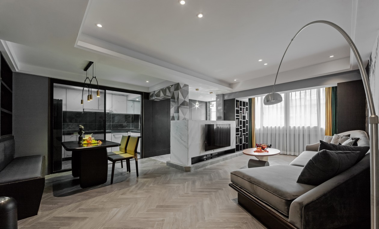 半高大理石电视背景与吧台合二为一的设计,没办法的承重柱,使得两个空间相互独立却又建立了联系。