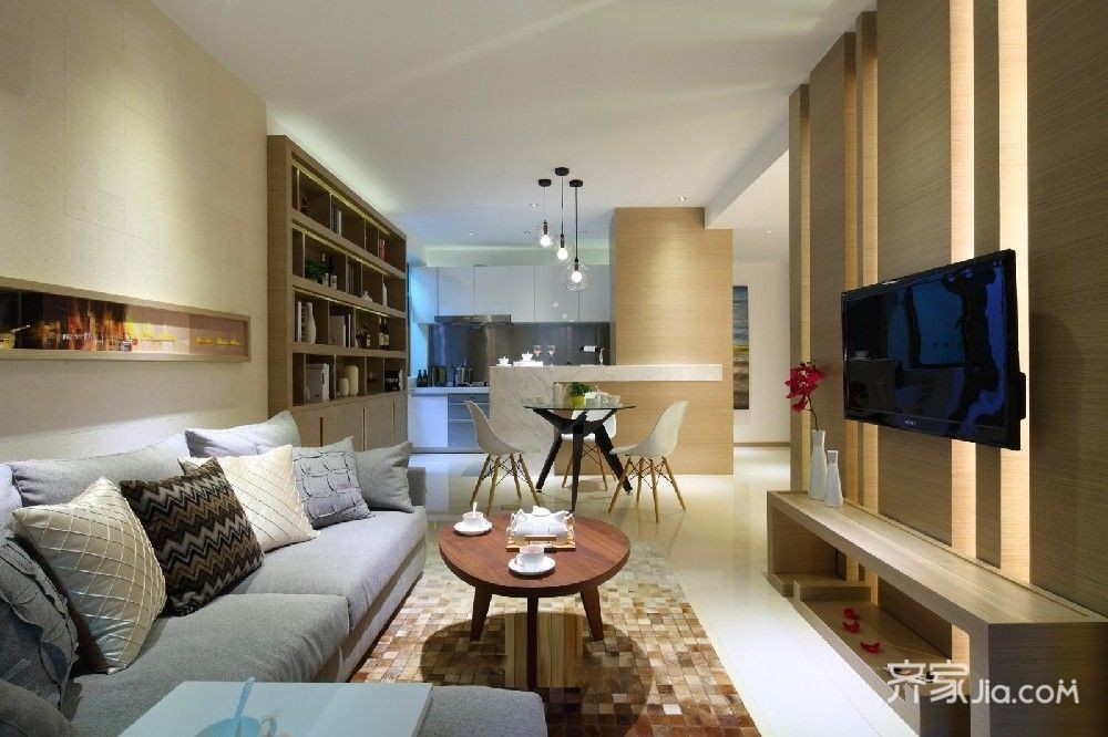 开放式的设计,餐厅与客厅相结合,整个风格融为一体,没有多余的装饰,相同的灰、白、木色调搭配,简约而不失精致格调。