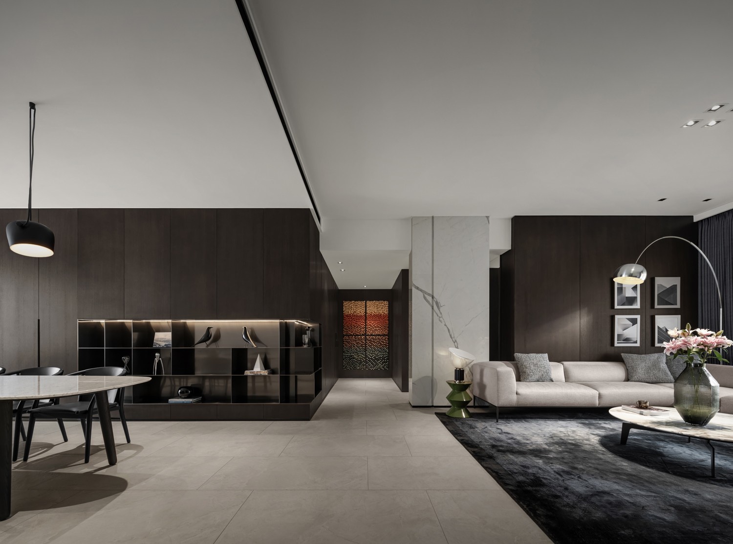 起居室,餐饮区以基于白灰主调,深棕体块穿插黑色线条,点到为止的深浅对比。