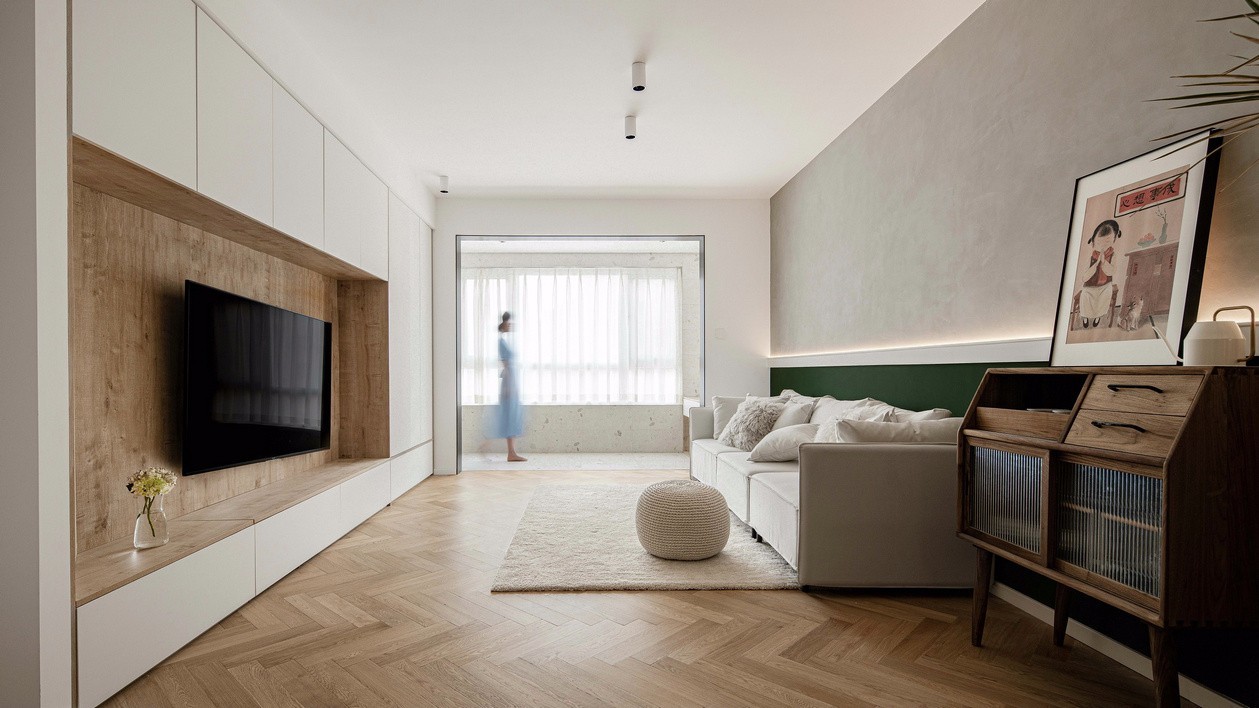 客厅没有挑选瓷砖的地板,而是选用木地板,这样会更加的耐脏。