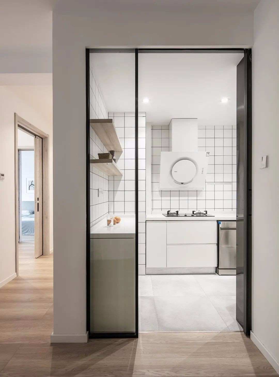 厨房,水泥灰地砖搭配白色方砖墙面,白色的地柜搭配木色隔板,清玻隔断以入墙移门隔离油烟,但不影响空间的通透性。