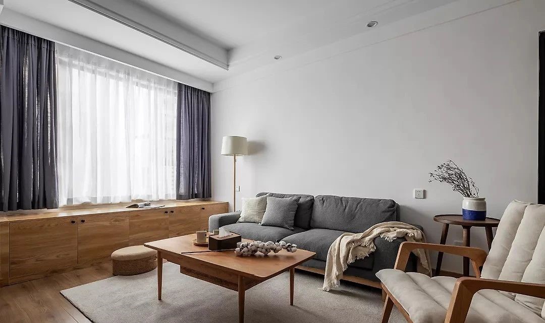 客厅选择更为适意的原木色搭配白色利用窗户下方墙体的位置以整排飘窗柜打造立体空间上的附加面积储物与坐卧均可。