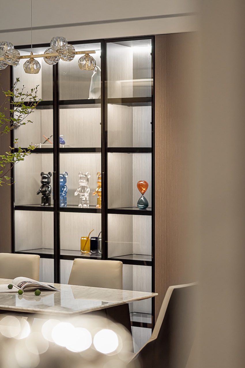 网红摆件与抽象画作随心点缀着空间,共同交织形成统一的艺术整体,客厅俨然成为一个小型展厅,创造出一种现代空间的先锋探索,丰富了建筑的审美体验和韵律感。