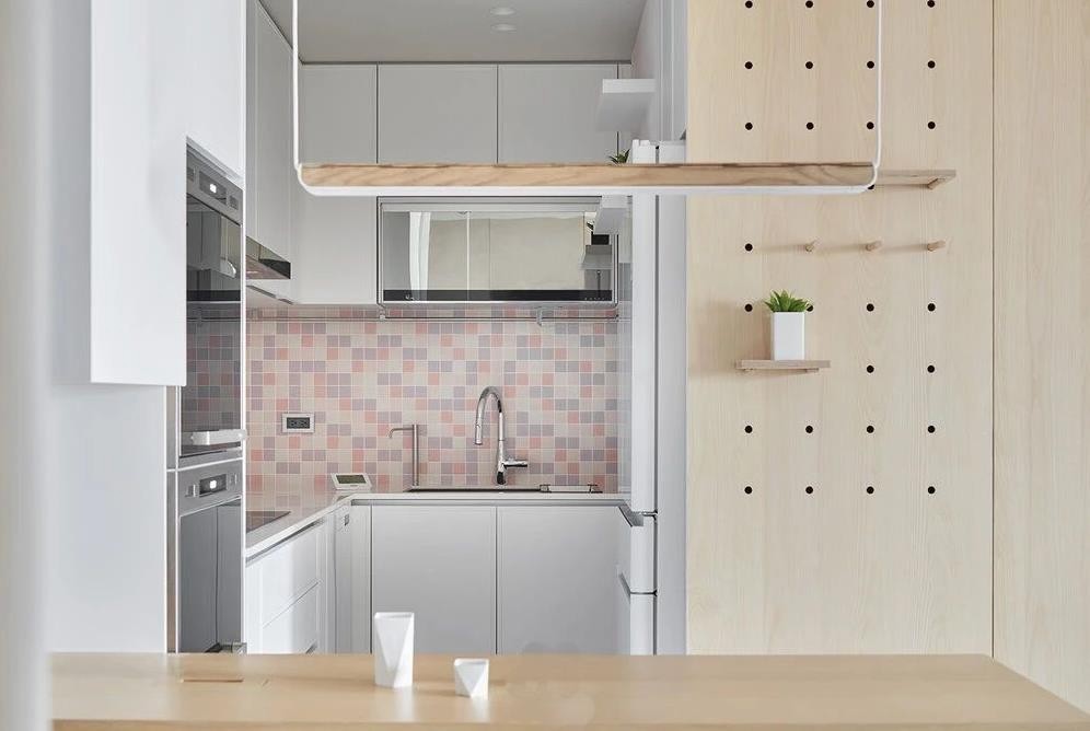 厨房部分,地坪使用矿物涂料与电视墙面整合,左侧餐桌则为厨房延伸。而因为女主人喜欢有点粉色元素,所以我们选择比较可爱的马赛克砖贴在厨房中段,让空间比较活泼一点。