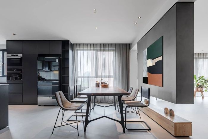 黑色哑光厨房安置了一个家庭的源动力,简洁明了的色调与悬挂式电视墙遥相呼应,体现出后工业时代的精工质感。