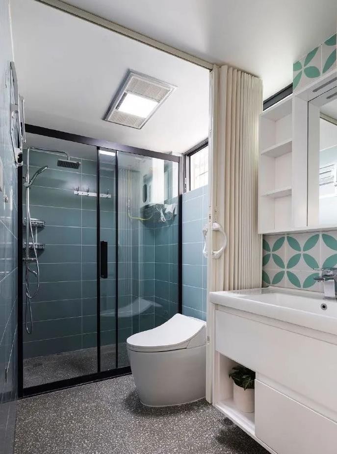 卫生间将洗漱区、马桶区还有淋浴区分别用布帘和玻璃进行了隔断,实现了三分离的效果,节省空间的同时,洗漱如厕互不打扰,提高了生活效率。