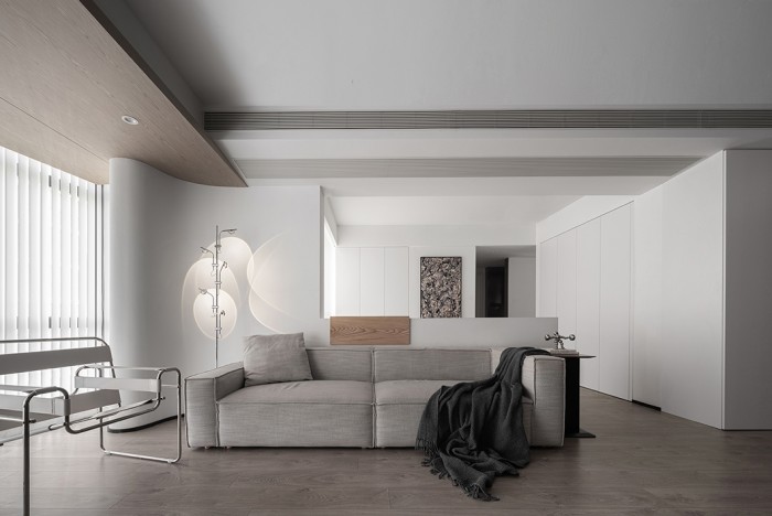 看向客厅,通透开阔的视觉效果,一眼纵览整个公共区域的全貌。白色与浅灰色柔和交融,搭配局部原木色的点缀,冷静中多了一丝的温柔,不需要多余的家具和装饰,尽可能留给孩子多一些活动区域。