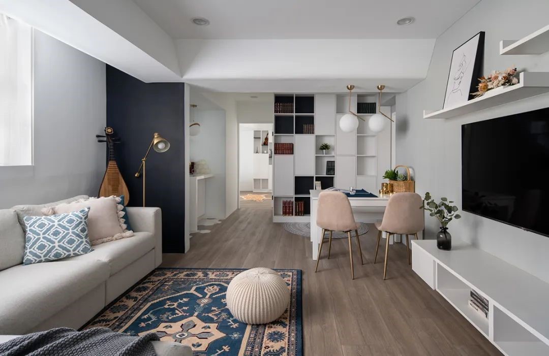 鉴于客厅面积小,入户处用素雅与花纹六角砖做为空间的分隔。将原来的平窗改为凸窗,扩大日光照入面积,以此消除了天花大梁的压迫感。一面墙面做成了书柜。书柜柜门开放式+封闭式设置,拿捏恰到好处。客餐厅设在同一个空间,是小户型扩大使用面积常用的方法。