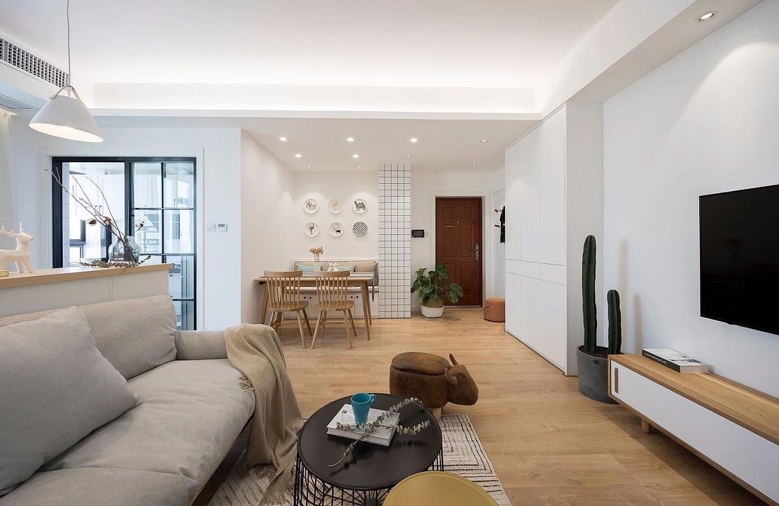 配色上以原木色为主,适当的绿植,使空间充满生机。线条以直线型为主,客餐厅无主灯设计让空间更加简洁。