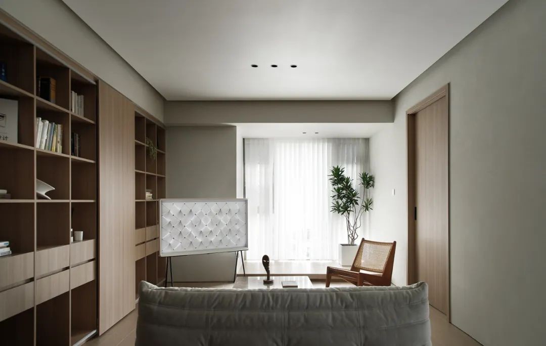 在客厅设置了整面的开放格书柜,既有收纳又有展示的空间,根据喜好放置书籍、艺术摆件等,随时保持家的新鲜感。
