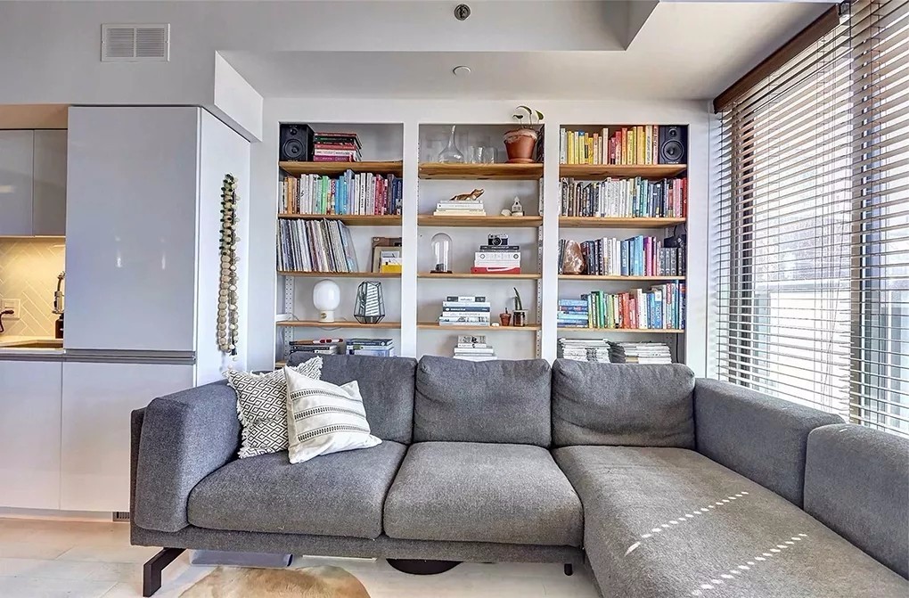 设计师在客厅融入图书收纳元素,将沙发背景墙改造成一个嵌入式书架,原木色书架层板的引入将单调的白色空间注入一丝文艺气息。