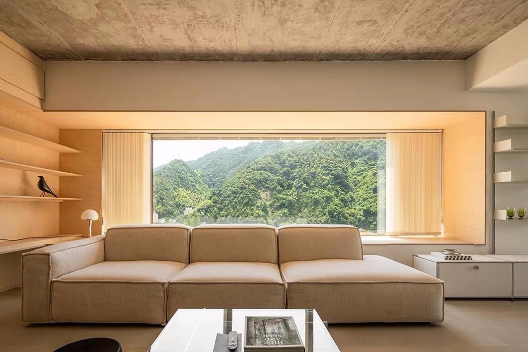 当打开垂帘,翠绿的山野映入眼前,午后的阳光通过窗台的桦木材质反射,将整个空间“染”上昏黄,显得恣意、悠然。