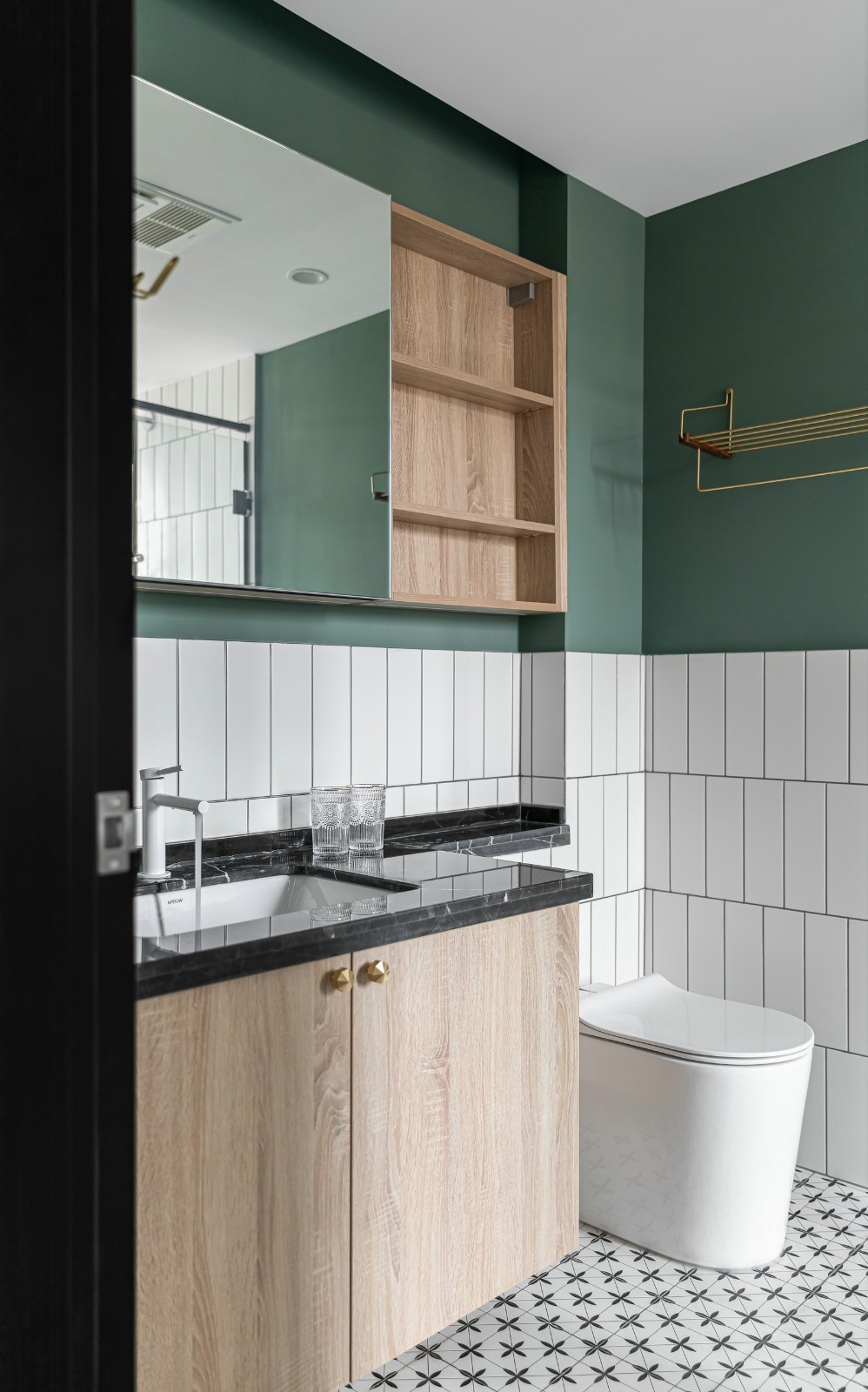 空间局限,只有淋浴房内有采光.地面和墙面大面积的白砖铺贴,让空间更干净明亮, 半墙砖半乳胶漆的设计减少单调给空间注入一丝活力.