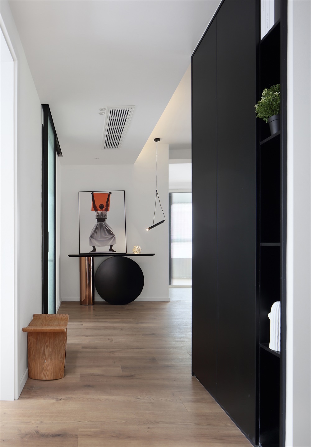 转角的黑色鞋柜与餐厅的背景浑然一体,既是空间的延伸转折,更是功能上的体现。直对入户的端景用一个后现代的玄关柜,搭配艺术画,让进门的空间成为视觉纵向的引导。