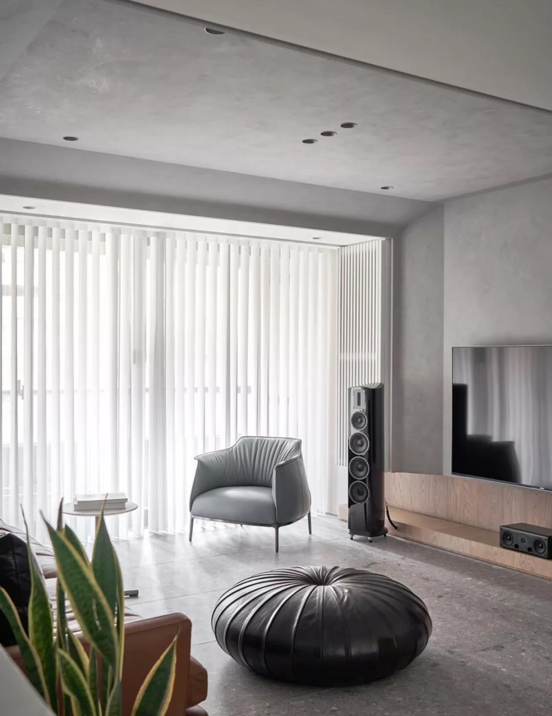 客厅以水磨石瓷砖铺地,采用灰色涂料在天花板延伸到立面,下衔接到电视柜再改以温润木色接续,靠窗处以白色窗帘勾勒洁净感,让采光无阻碍迈入室内,保持室内亮度。