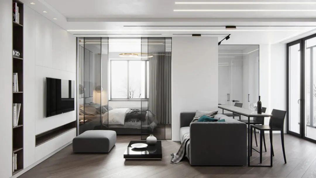 按照人体工程学形成空间,并为舒适的生活创造了条件。客厅通过滑动隔板与走廊隔开,当隔断关闭时,该空间将变成私人空间并完全隔离,当打开时,它可能会成为客厅的一部分。