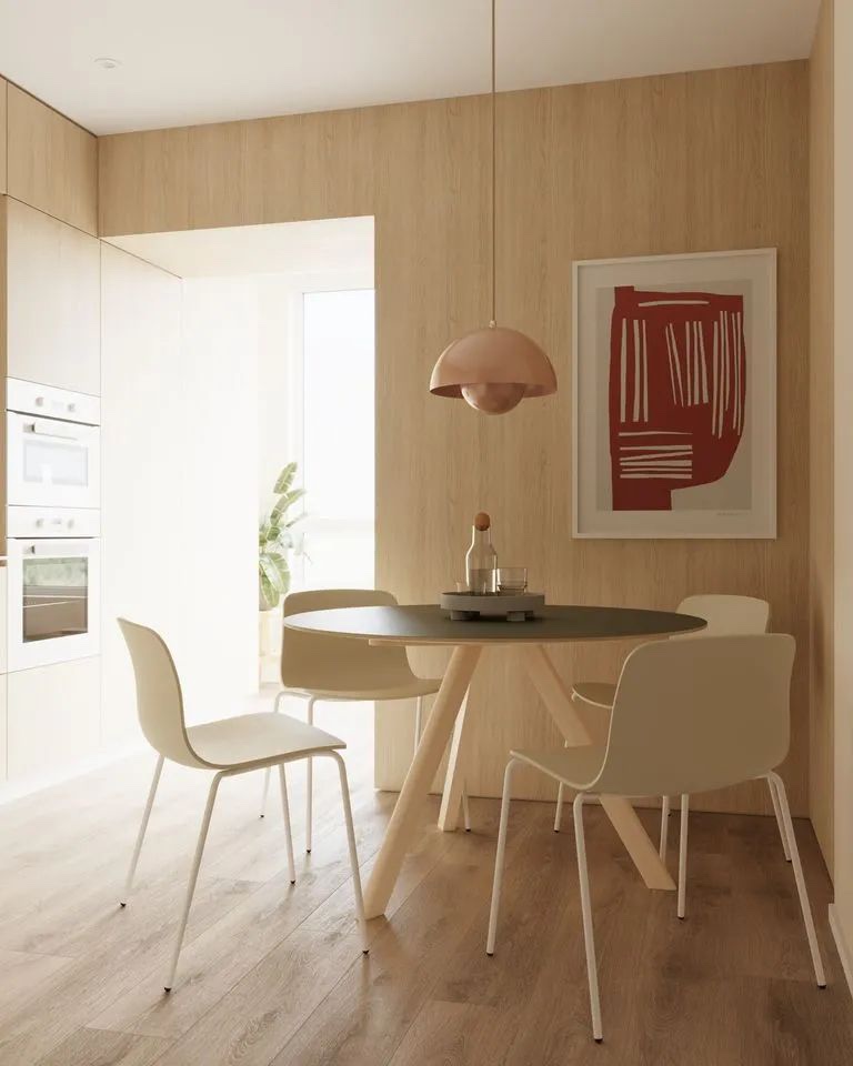 莫兰迪色系的桌面和吊灯 一绿一粉十分和谐 红色的抽象派壁画成为空间的焦点