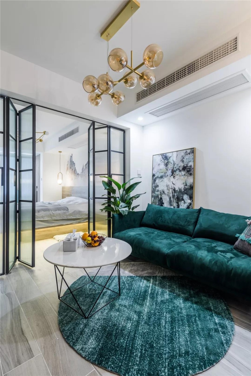 由于户型比较狭长,客厅没有对外的窗户采光,敞开式的设计将空间扩大,也能借到南北光。