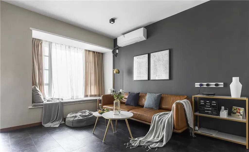 客厅以灰色的沙发墙为基础,挂上两幅简约的装饰画,搭配亮棕色的皮沙发,鲜明的对比色,让客厅空间显得更加简约而又活力。