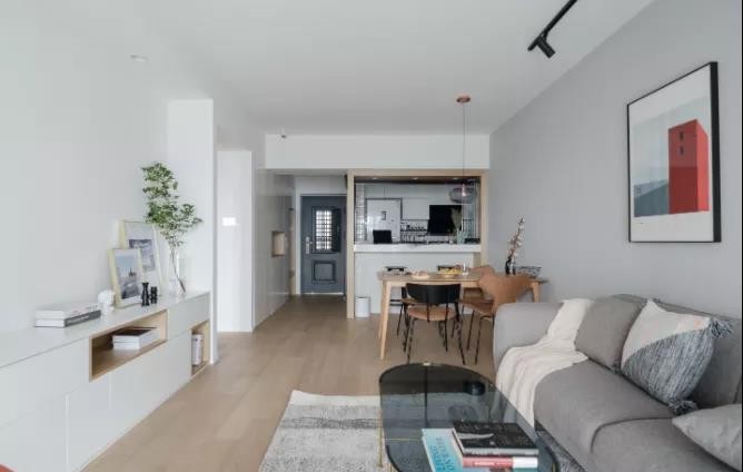 65㎡,是一个典型的小户型,空间是小了点,但这房子的装修设计却很有新意。众所周知,小户型在装修设计的时候,容易会出现空间拥挤、压抑的现象,而这个房子的装修效果恰恰相反,不仅空间通透,而且让每个房间都有了光。