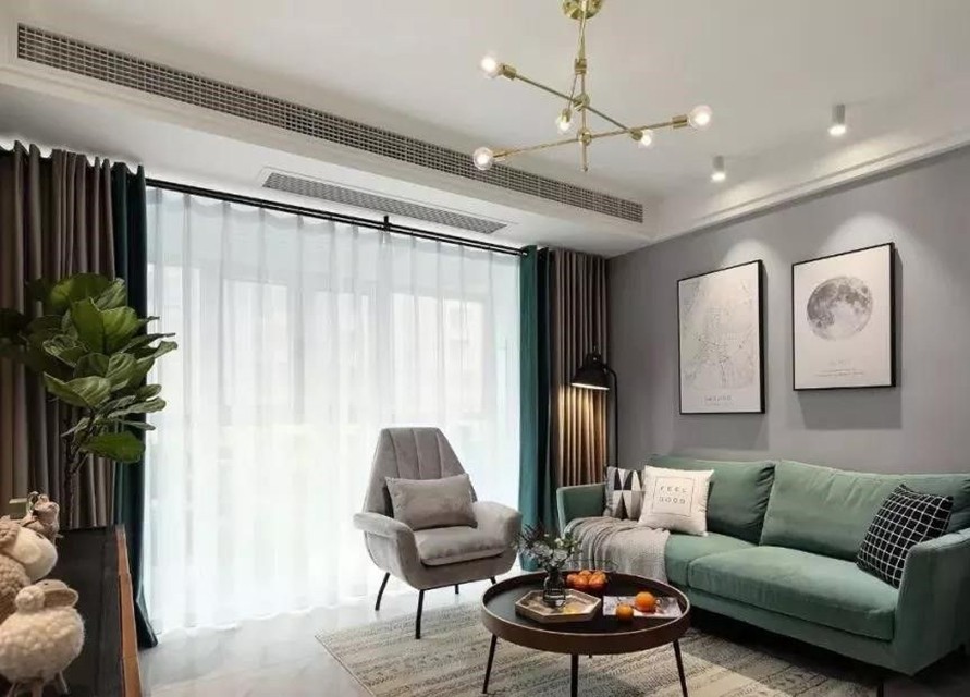 客厅,选择在软装布艺沙发和窗帘中,加入淡绿色元素,感觉整个空间都变得清新有层次感了许多。