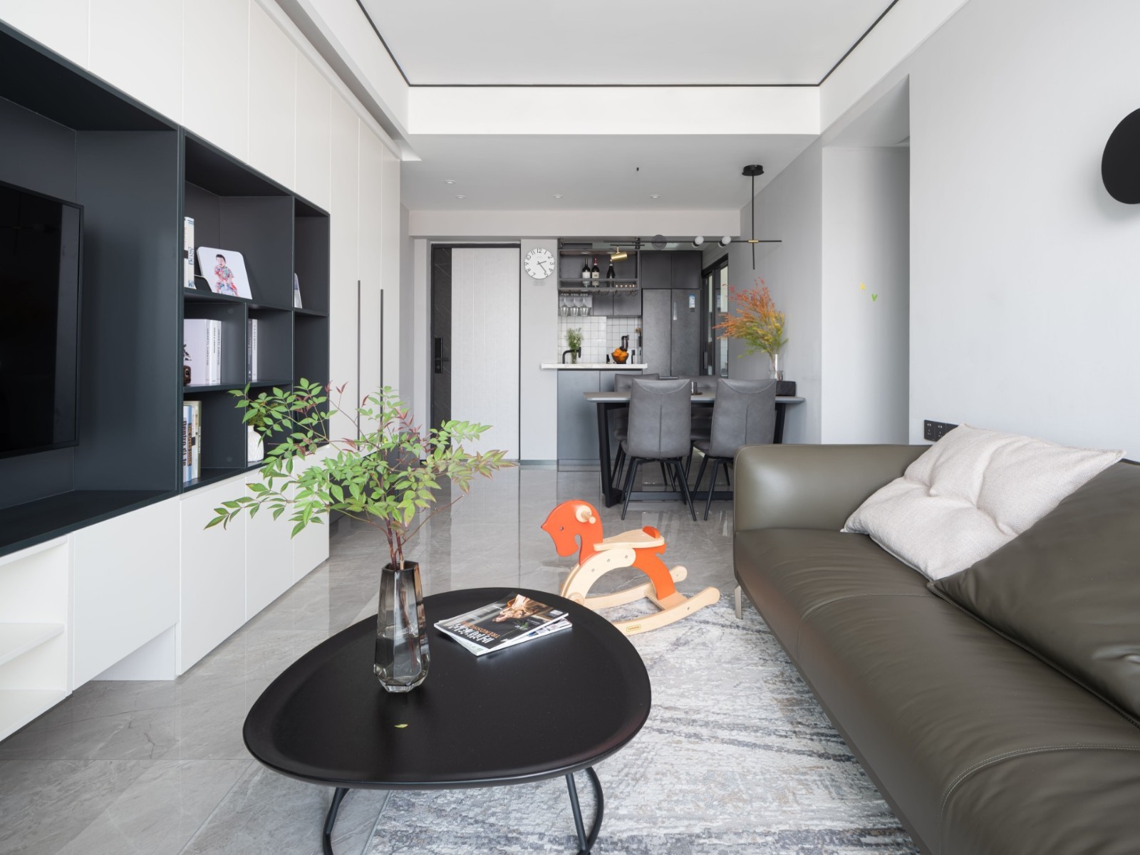 客厅中天花原顶镶嵌黑色不锈钢条装饰,简约有线条感。不规则黑色橡木茶几,灰色渐变玻璃瓶,插上禅意满满的南天竹,木与竹的搭配,带来几分典雅深沉的绿意。