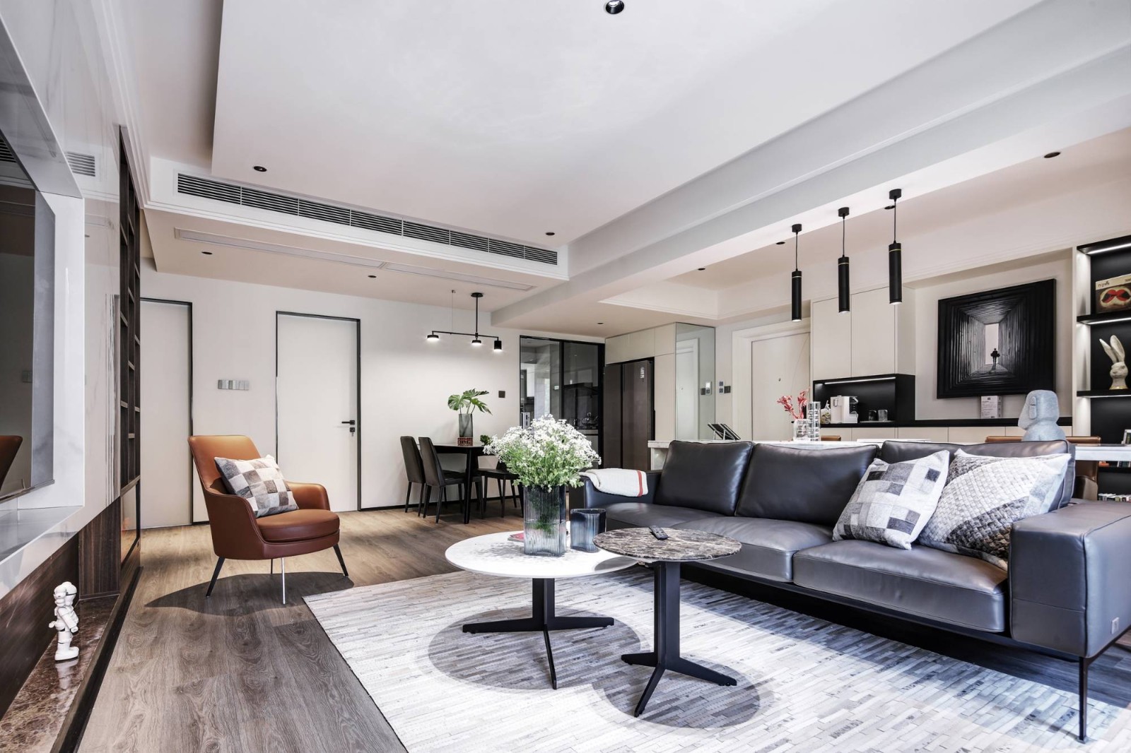 白色渲染明亮氛围,木色奠定舒适意境,家具则用深色来搭配,拿捏得当的色彩搭配所带来的现代设计感,不仅让客厅空间更显宽敞通透,而且大大提升了空间质感。