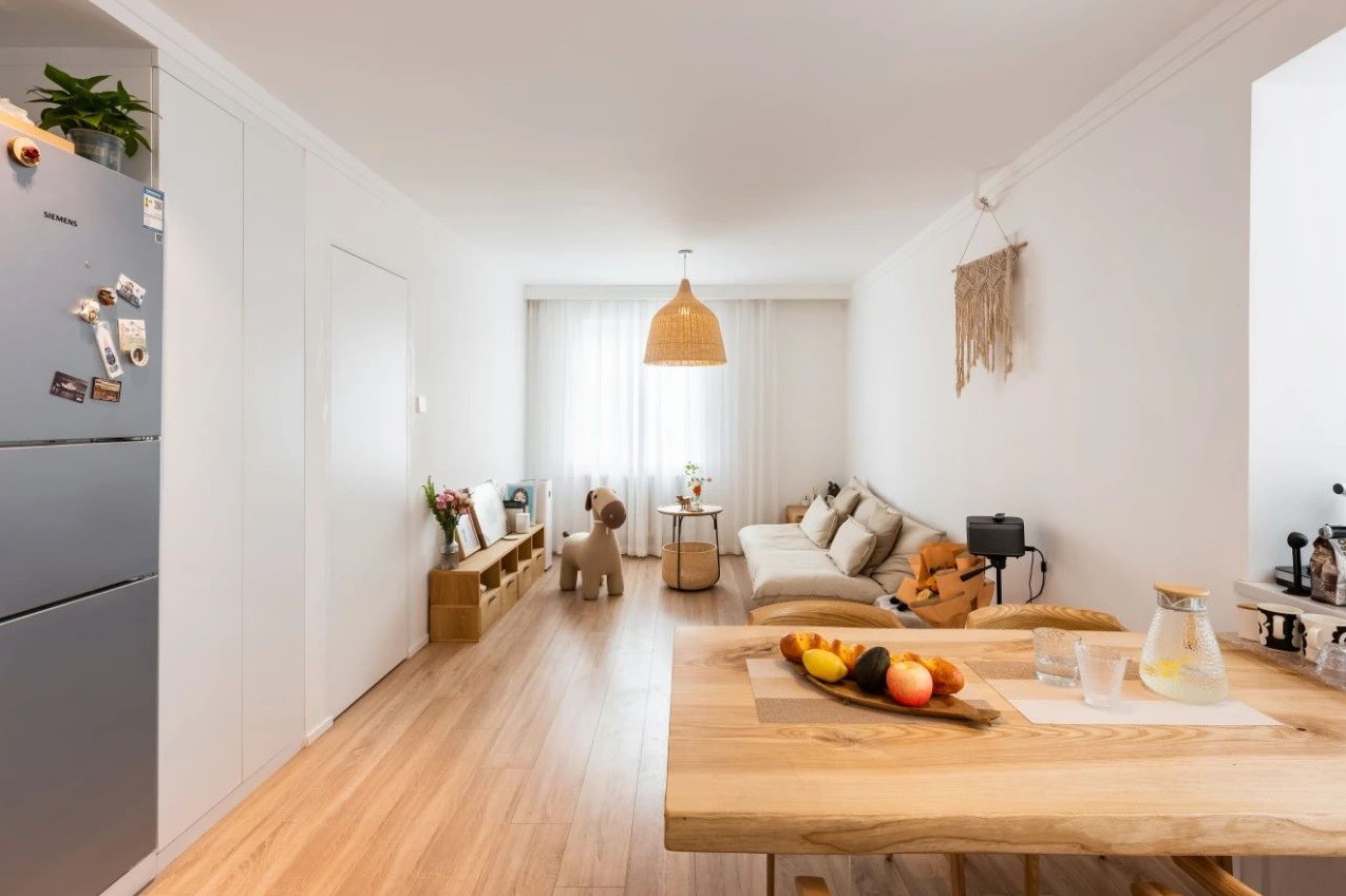夫妻二人居住,2居室足够用,也为了让空间更加明亮显得宽敞,拆除其中一个次卧变身客厅,空间体量感增加,同时更多的自然光可以引入到餐厅区域,给人带来更好的居住感受。