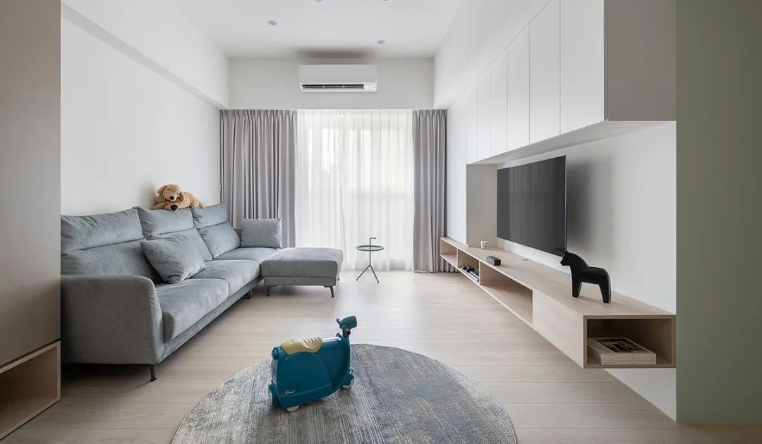 客厅拥有大面采光 以及通风***的先天优势条件 透过大自然基调的配色原则 并规划倒 L 型的白色量体作为表现与收纳所用 使之达到轻量化的悬空轻盈感