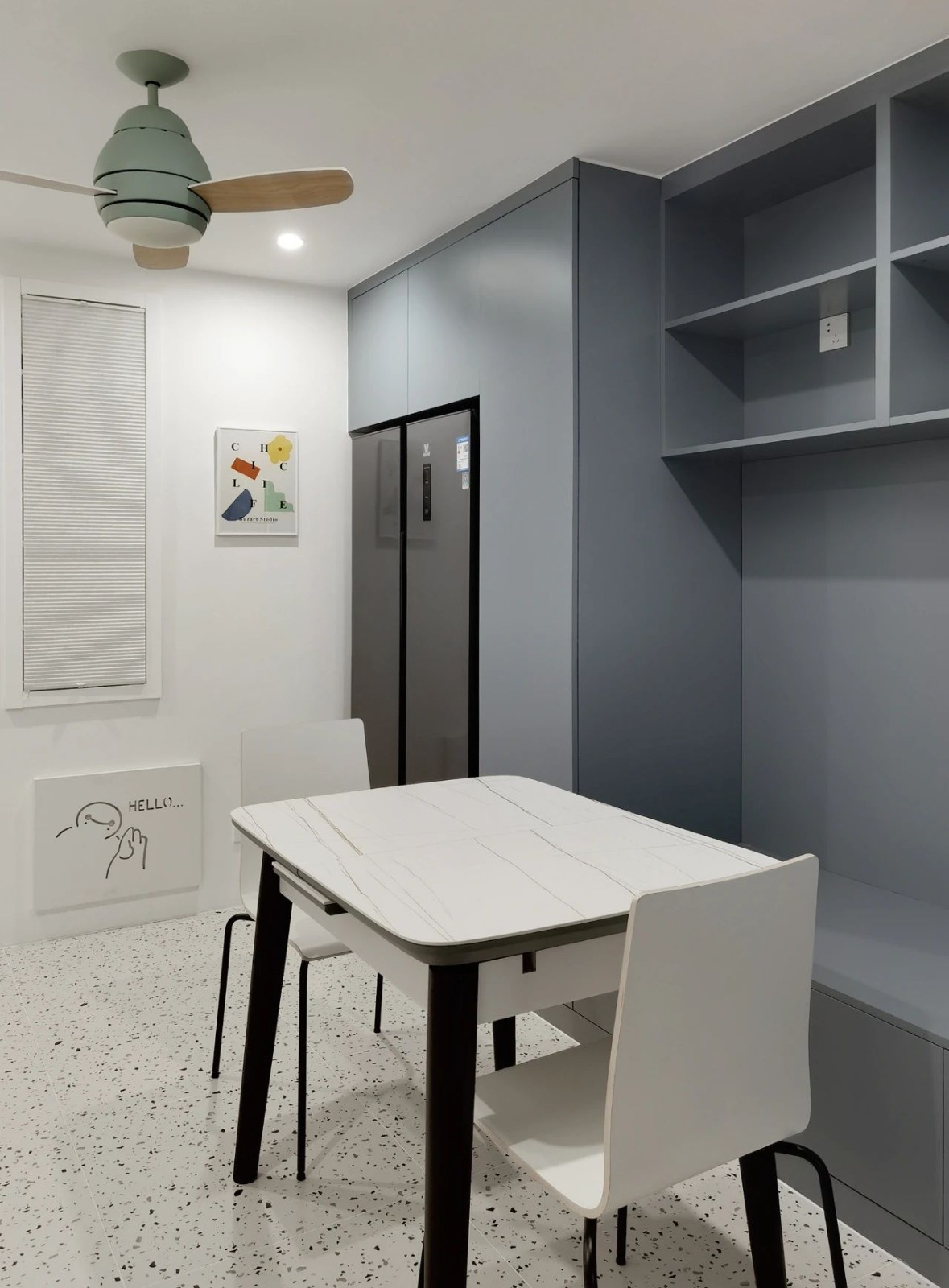 餐厅的总宽度只有3米,为了给左侧留出更大的活动过道,餐厅右侧选择卡座+立柜,既有收纳又有座位空间,完美协调美观和实用性。