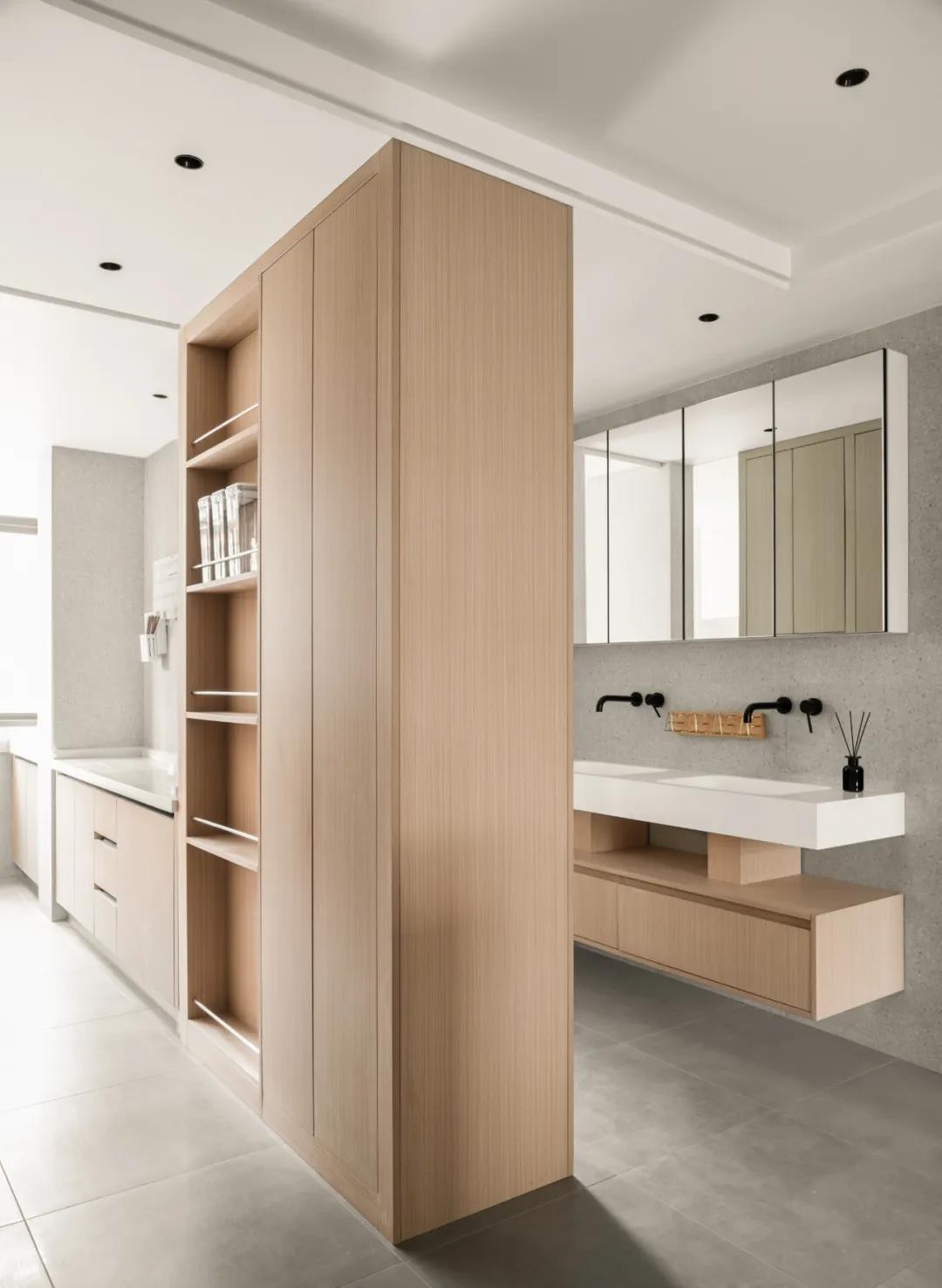 进门玄关原有门头比较高,超高门更大的拉高室内层高。全身衣镜方便出门之前的整理,入户右手边是定制的双面盆,台盆采用墙排水形式,悬空更整洁方便打理,收纳于无形,保持台面的干净利落。