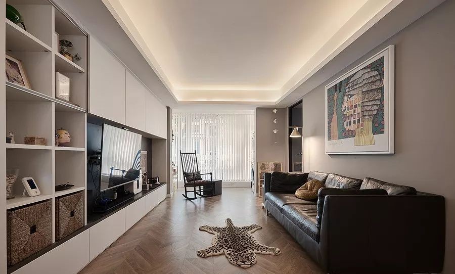 客厅电视背景墙长5m,打造了整面墙的电视机柜,因此拥有非常强大的收纳和展示空间,上层的柜门使用了滑动门,避免了开门对整面墙有过度分割感。