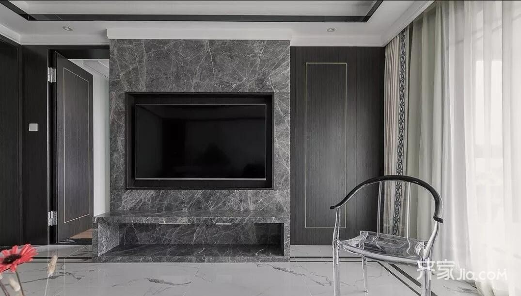 景墙本来不大,将一侧卧室门做成隐形门,另一侧做了对称装饰,中间用大理石砌了电视柜,整个墙面得到延长,空间显大不少