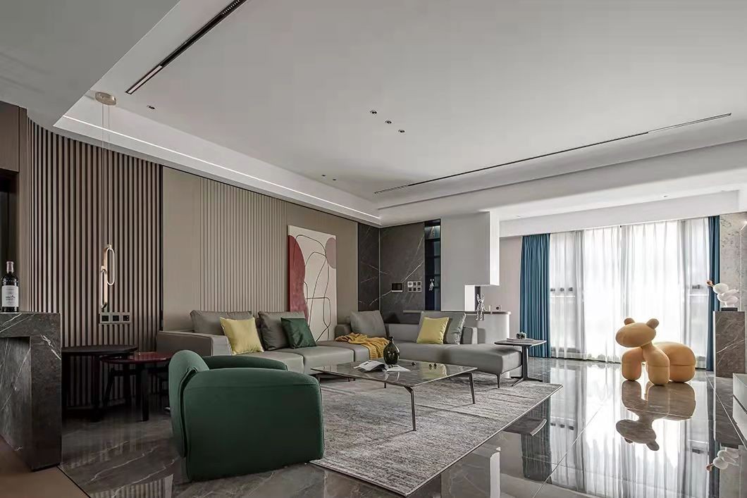 设计师洞察了业主对高品质精致生活方式的探求,用莫兰迪色系铺陈客厅,脱尽繁忙生活的火气,氤氲出足以让人心神安宁的静谧氛围。