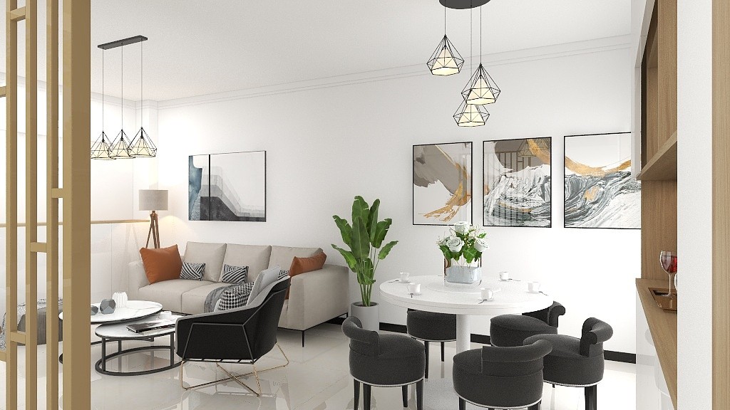 客厅采用白色与黑色相搭配,橙色作点缀,让整个空间简约大方,轻快明亮。