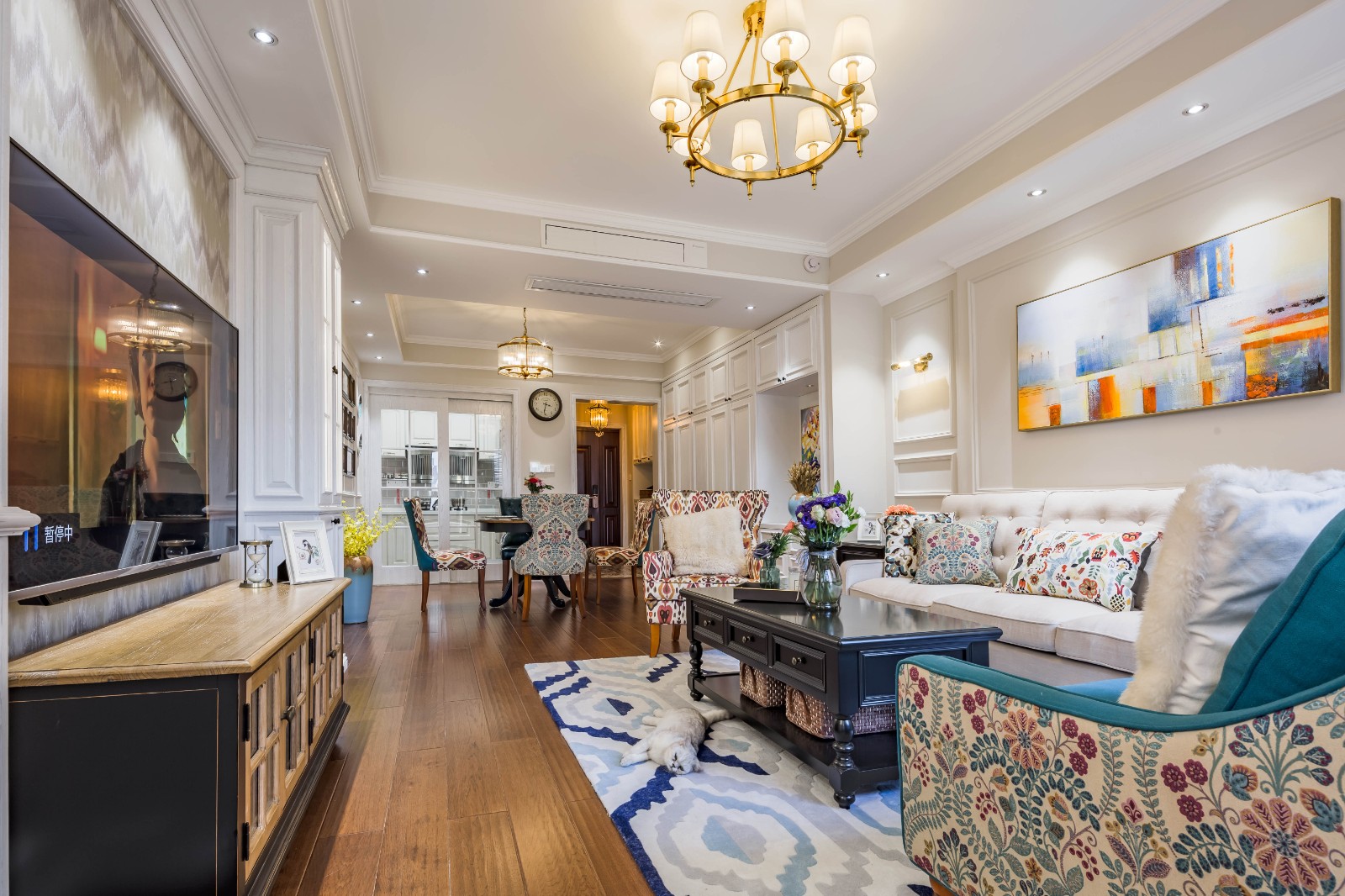 客厅背景墙是现代简欧风格,家具是自然田园风格,两种风格相得益彰,妙趣横生
