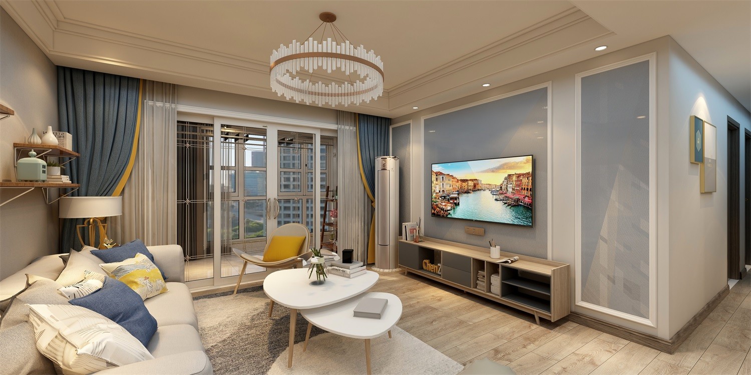 客厅:蓝色电视背景墙搭配白色沙发,温馨柔软提升空间的情调。