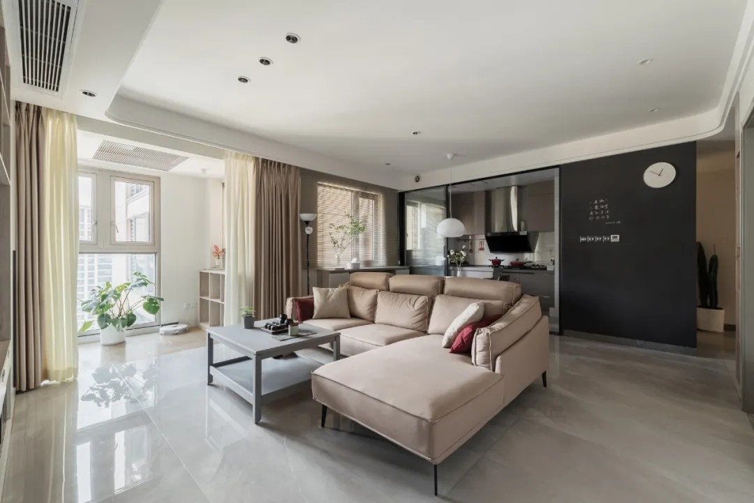 客厅与阳台打通,在阳台侧边放一个小收纳矮柜,等未来有孩子了,这个角落还是孩子玩耍的好地方,采光好又够宽敞;还在在边上玩耍,家长在客厅闲坐,拉近了家人的陪伴距离。