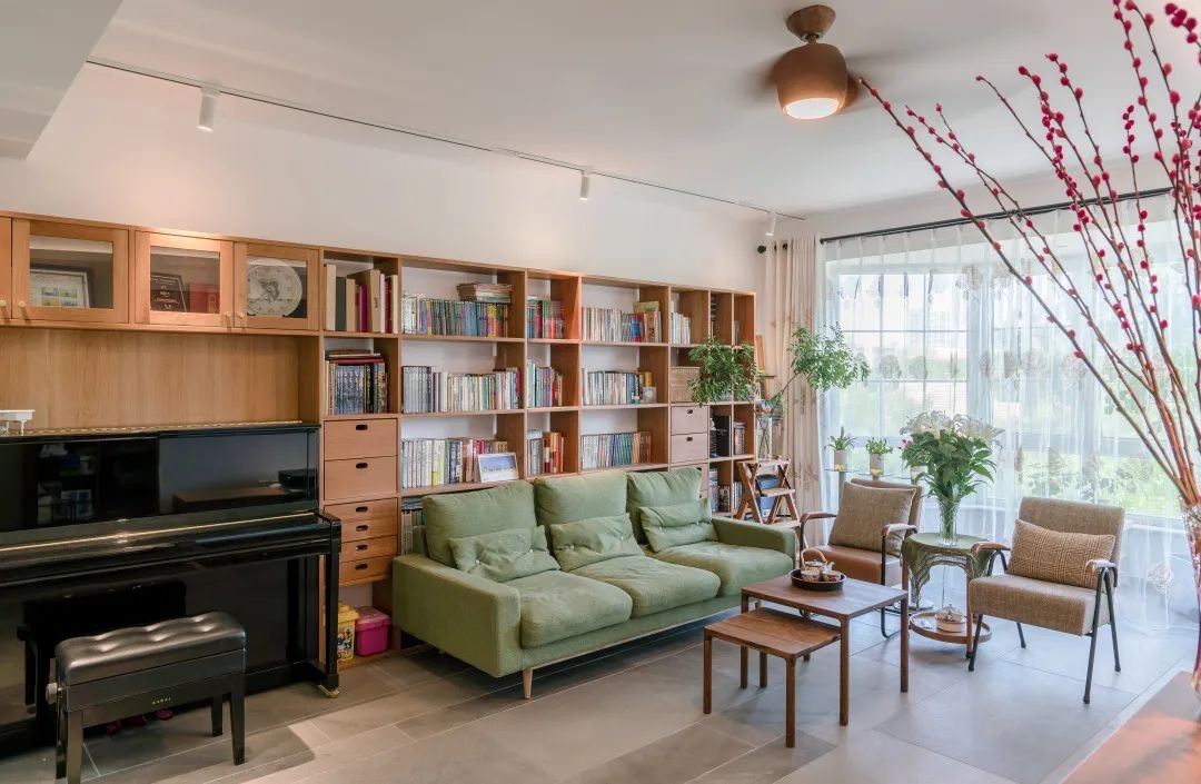 客厅纯白色的墙面与木色的温润,是光影的背景色。沙发背后的空间却被打造成了“家庭图书馆”书香气浓郁,满满的学习氛围。