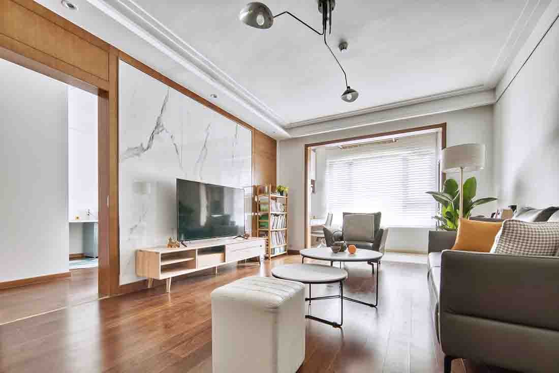 客厅区尽量保持留白,没有做过多的修饰。只是在东墙有一个通次卧的门洞,利用线面使其进行了统一。在其中间镶嵌了三块800*2400规格的爵士白岩板,使得整个空间具有了灵性。