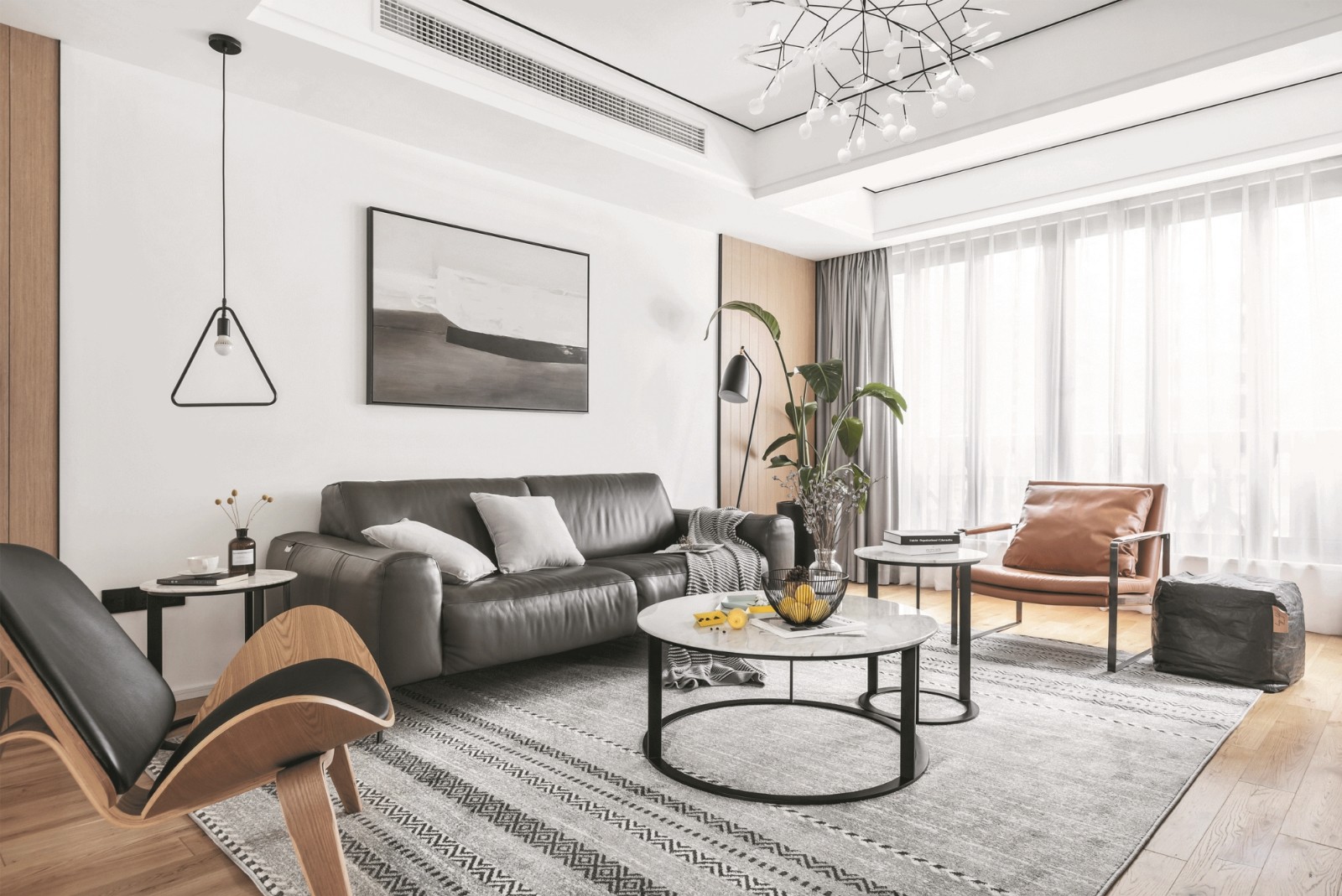 客厅仍然以白色为主色调,通过原木色的融入以及灰色的过渡,呈现简洁明快的生活气息。