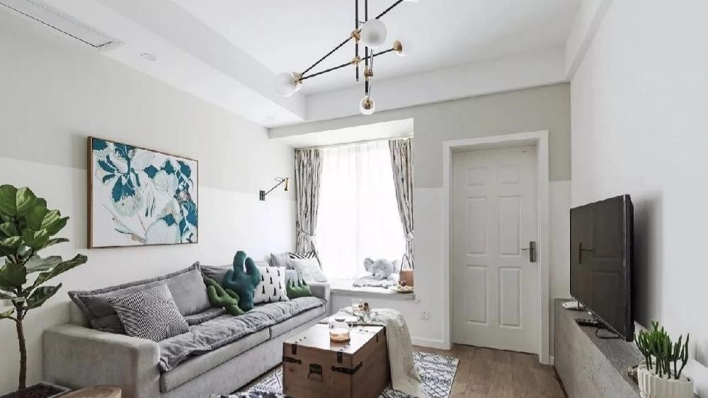 客厅装修为纯正的北欧风,清爽干净,色调以乳白色、灰色、咖色为主。电视柜没用普通的木柜,而是靠墙砌水泥台,不占地方又有特色,漂亮!