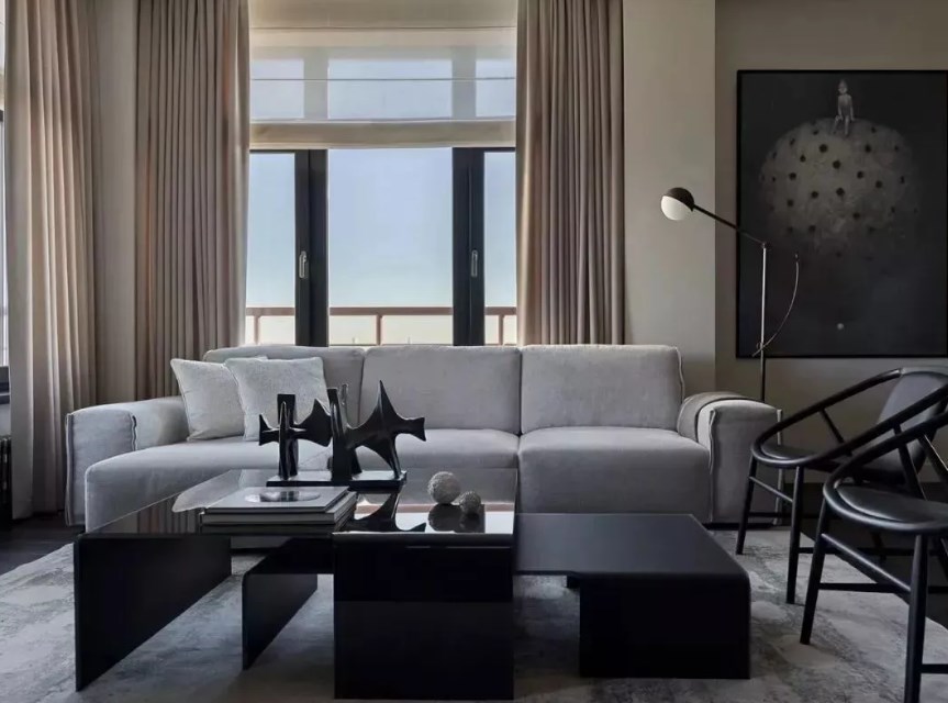客厅墙壁的中央突出部分是用黑色大理石框起来的。室内的家具具有复杂的几何形状,能更好地支撑和互补。