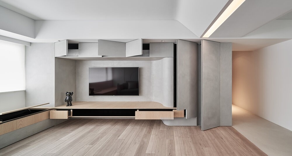 电视墙因为两面皆有大柱子,我将柱子与柜体包覆,藉由两种柜体穿插,弱化柱子的压迫感。