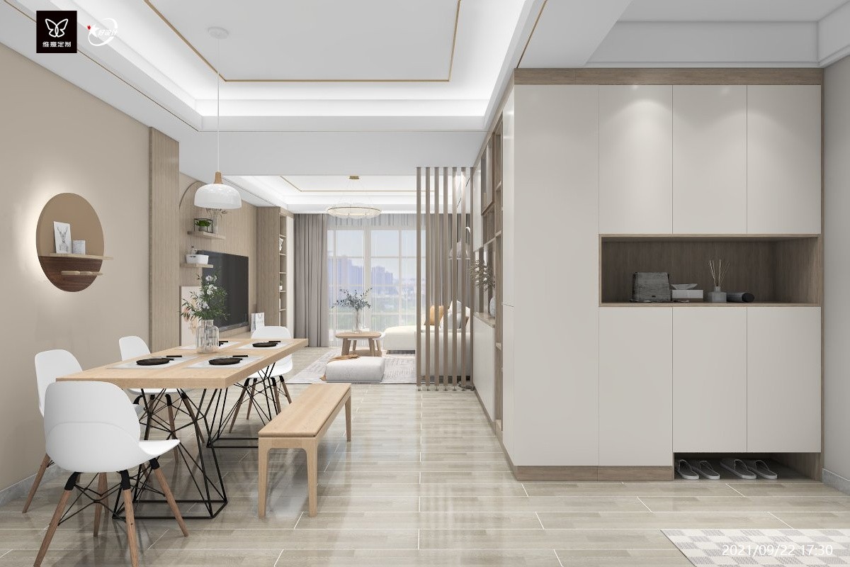 餐边柜的浅木色配白色门板和玻璃门的搭配